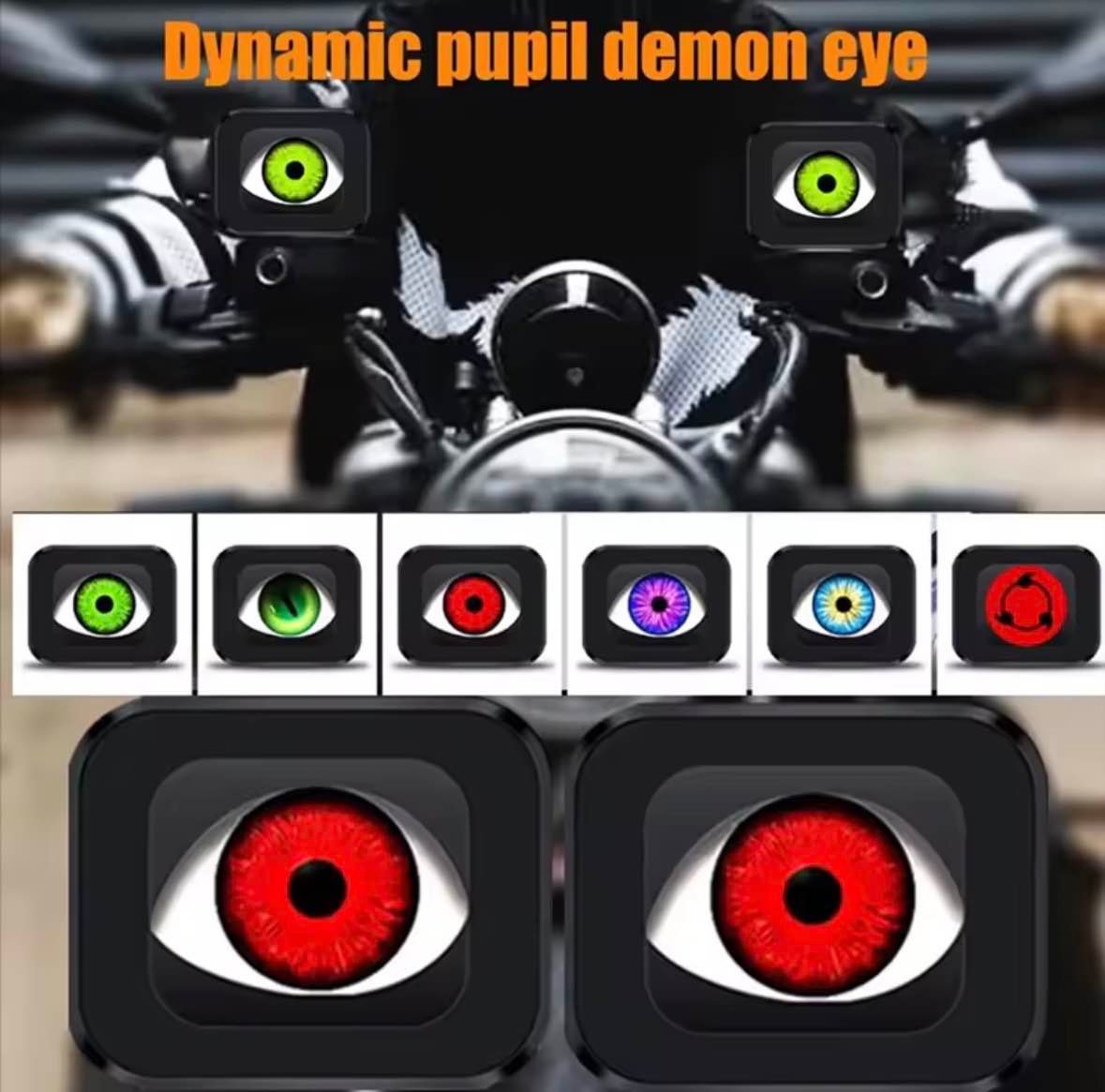 Stylish Devil Eye Design: Features an aggressive “demon eye” LED look that instantly upgrades your bike’s aesthetic, day or night.· Integrated Rearview Mirrors: Combines essential safety with style. The bright LEDs are built directly into functional mirror housings.· Dynamic Lighting Effects: Creates a vibrant, eye-catching display with dynamic color patterns for a truly custom look.· Simple Retrofit Kit: Easy plug-and-play installation designed to fit most motorcycles without complex modifications.· High-Intensity LEDs: Offers brilliant, long-lasting illumination that ensures high visibility and a premium appearance.