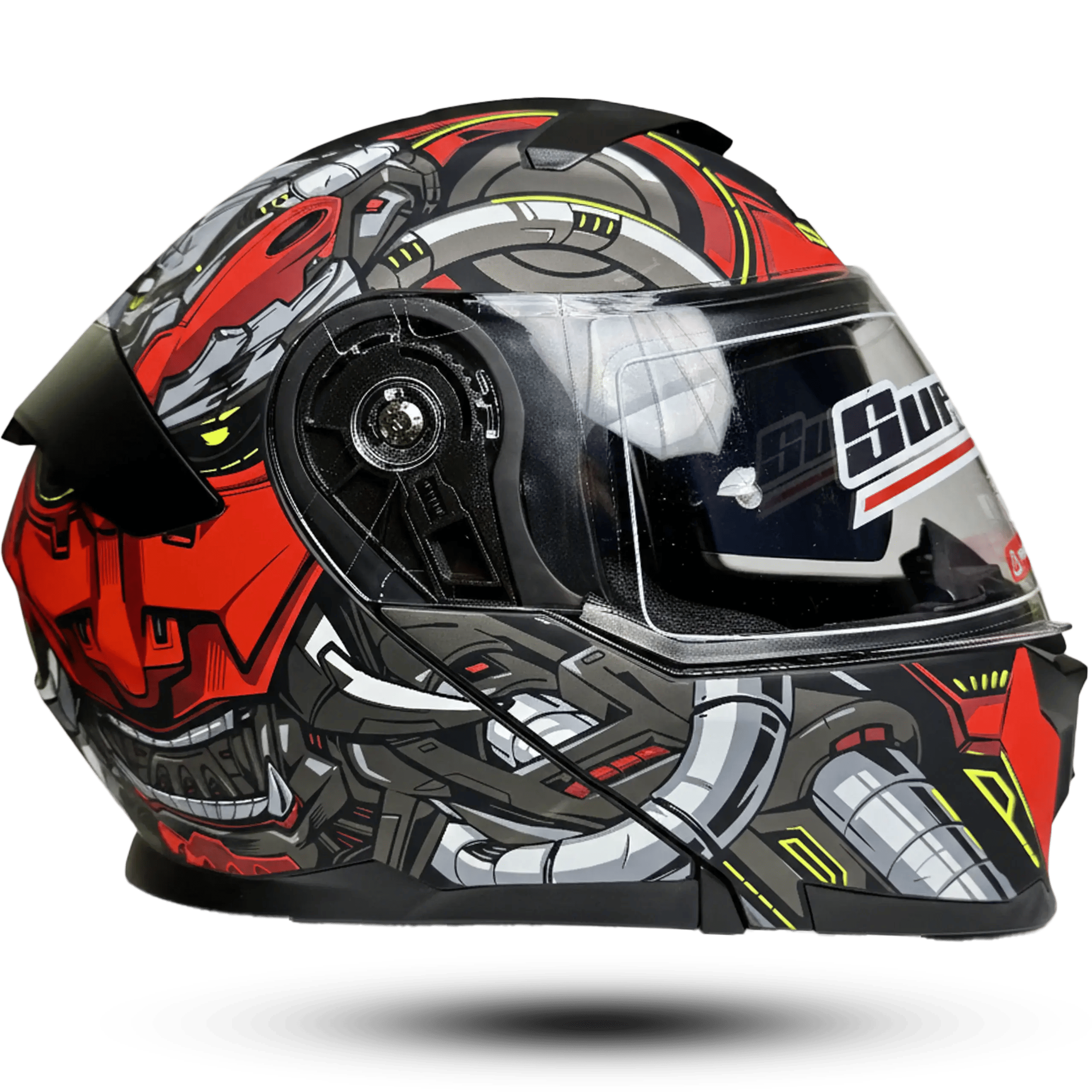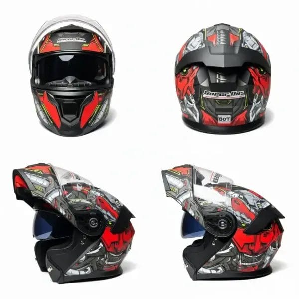 Unleash aggressive style with the Super Air 912 Red Mecha Edition. This modular helmet blends a futuristic robotic aesthetic with the versatile functionality of a flip-up design. Featuring a high-impact shell, dual-visor system, and DOT-certified safety, it’s built for riders who demand performance and a bold visual