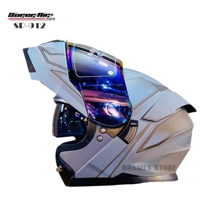 BRAND : Super Air MODEL : SP-912 White Light Grey STYLE: Uplift with Spoiler VISOR : Dual Visor (ANTI SCRATCH) SAFETY: DOT CERTIFIED Removeable and washable Padding Air Ventilation System Bluetooth Ready